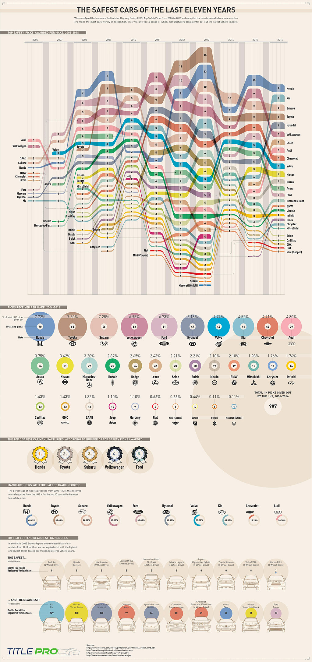 For many people, style and gas mileage are the most important criteria when buying a new vehicle. For others, safety ratings are the most critical in their list of evaluation requirements. The Insurance Institute for Highway Safety, known as the IIHS, is the group most well known for safety ratings of vehicles that deliver reports to the public that rates which vehicles have the highest chance of survival and lowest risk of injury during severe crashes. This infographic breaks it down from 2006 to 2016:
