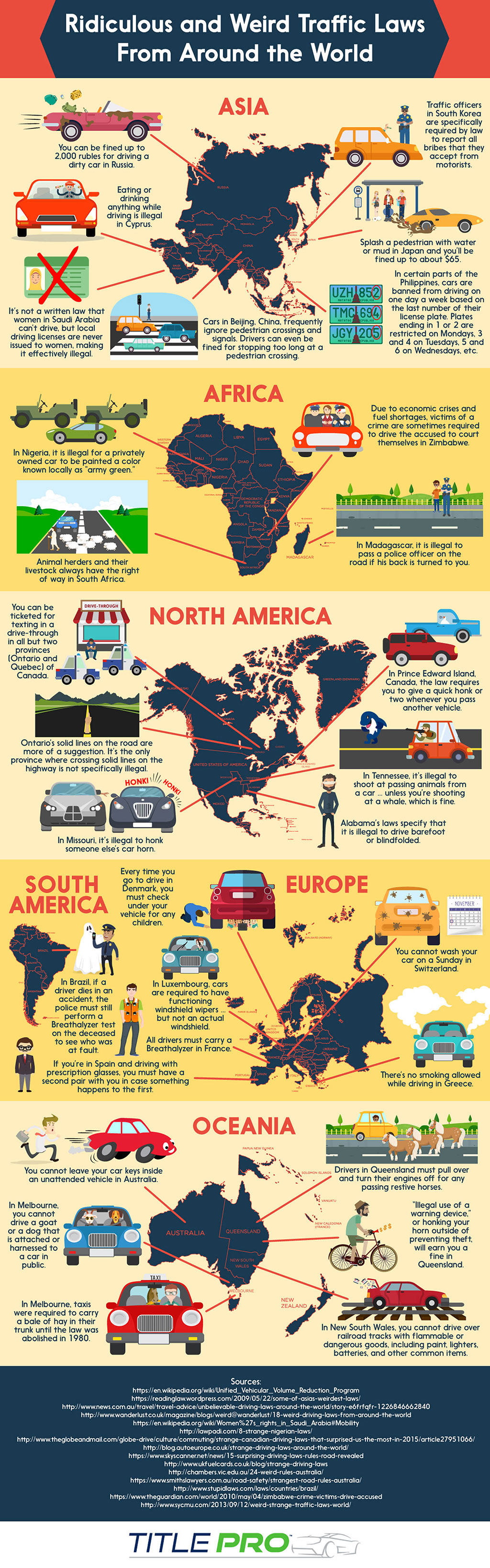 Strange and surprising traffic laws exist on every continent. Some are more outlandish than the other. This infographic shares some of our favorite unusual traffic laws that still exist today! How about in Australia, it’s illegal to leave your car keys in an unattended vehicle. How many incidents needed to happen for that law to be passed…? There are so many other strange and weird traffic laws below!