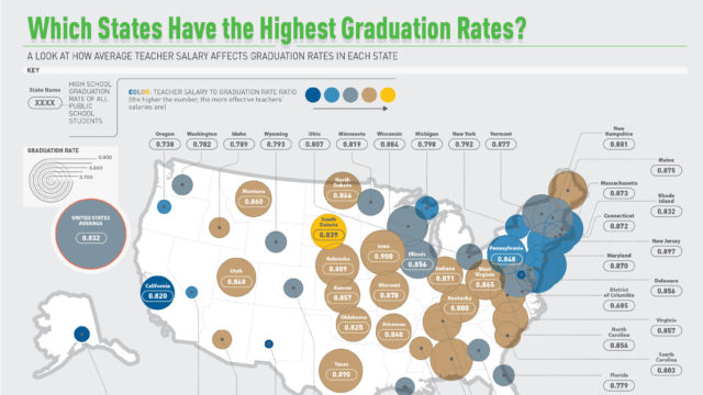 Have you ever wondered if higher teacher salaries lead to higher high school graduation rates? Well, we set out to answer this very question. In short, there isn’t much of a correlation at all. States like Iowa have the very best graduation rate with 90.8% of all students graduating high school, and their teachers enjoy only a modest salary. On the other hand, in Washington D.C., teachers are raking in an average of $73,162 per year, and their students have the lowest graduation rates in the United States at a depressingly-low 68.5%. How does your state stack up against the rest?