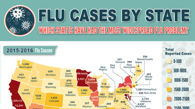 Are you ready for flu season? CDC flu map data reports that if you’re living in California, Minnesota, or Maryland, you might be more likely to get the flu. We’ve created a visualization showing the reported cases of flu by state to illustrate where in the country gets hit hardest by common illnesses. The flu prevalence by state varies a great deal, but remember that these are reported cases: Sometimes, a lot of people suffer in silence at home! Nevertheless, from the reported data that the CDC receives, this United States flu map from the past three years reveals that Mississippi, Arkansas, and more rural states don’t get quite as many instances as, say, Alaska. Check out the flu stats by state so far this year as well!